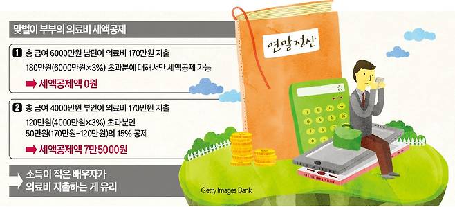 의료비는 반대다. 맞벌이 부부 중 소득이 적은 사람의 카드로 의료비를 몰아서 지출하는 게 유리하다. 의료비는 지출한다고 해서 무조건 공제되는 게 아니라 총급여의 3%를 초과하는 금액의 15%를 세액공제받을 수 있어서다. 소득이 적을수록 공제 기준을 맞출 가능성이 크다. 예를 들어 총급여가 6000만원인 남편과 4000만원인 부인이 있다고 가정해보자. 남편은 의료비 170만원을 지출했어도 의료비 공제를 받을 수 없다. 총급여 6000만원의 3%인 180만원 이상 쓴 의료비의 15%를 세액공제받을 수 있기 때문이다. 부인은 120만원(4000만원×3%) 넘게 사용한 의료비의 15%를 공제받을 수 있어 50만원(170만원-120만원)의 15%인 7만5000원을 세액공제받는다.