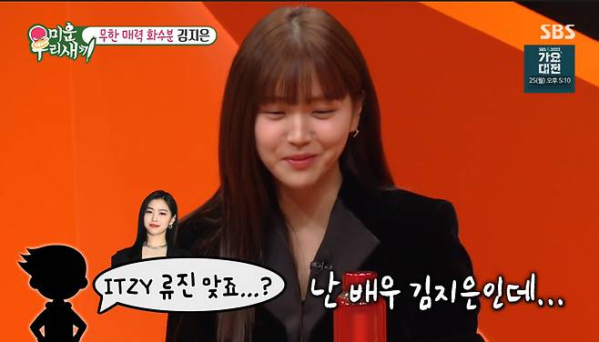 김지은은 "같이 드라마 찍은 아역 친구가 스케치북 가지고 오더라. 같이 연기했으니 인사하러 오는 줄 알았는데 '잇지 류진 맞죠?'라고 하더라. 또 다른 행사장 갔더니 잇지 류진씨라고 말하길래 아니라고 했다"고 실제로 오해받은 사연을 전했다.