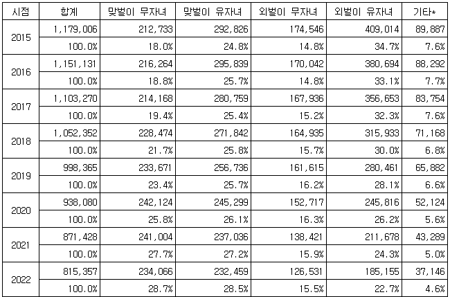[표] 맞벌이 여부 및 자녀 유무별 초혼 신혼부부 추이