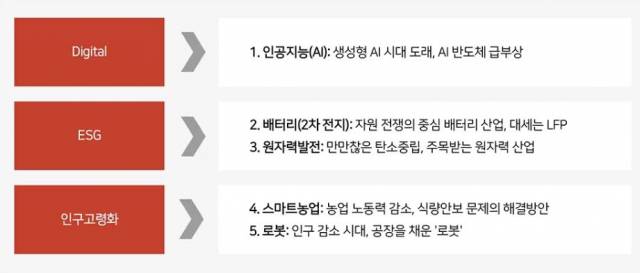 삼일PwC 경영연구원은 ‘2024년 주목해야 할 산업’ 보고서를 내고 주요 패러다임으로 ‘디지털’과 ‘환경·사회·지배구조(ESG)’ ‘인구 고령화’를 제시했다. 이에 따른 5대 유망 산업으로 AI와 2차전지·소형모듈원전(SMR)·스마트농업·로봇을 선정했다.