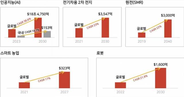 먼저 AI는 성장성과 미래 시장 규모가 커 핵심 기술로 꼽혔다. 삼일PwC와 글로벌 시장조사 업체 스태티스타에 따르면 AI 산업은 연평균 36.6%씩 성장해 2030년 세계시장 규모가 18조 4750억 달러(약 2경 4368조 원)에 이를 것으로 전망된다. 이는 지난해 미국 국내총생산(GDP) 25조 4627억 달러의 72.6%에 해당하고 중국 GDP(17조 8760억 달러) 전체 규모 대비 3.3% 많은 수치다.