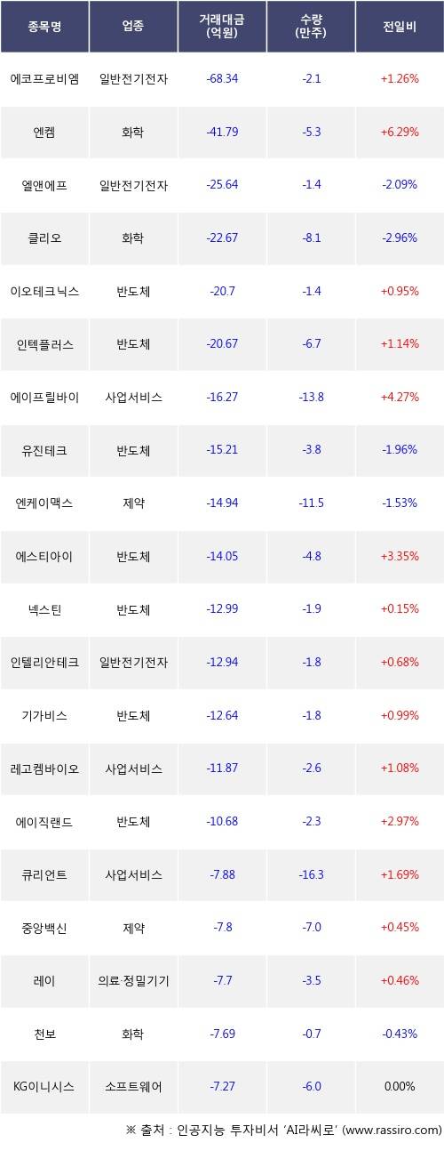 기관 투자자의 순매도 상위 20개 종목은 에코프로비엠, 엔켐, 엘앤에프, 클리오, 이오테크닉스, 인텍플러스, 에이프릴바이오, 유진테크, 엔케이맥스, 에스티아이등이다.