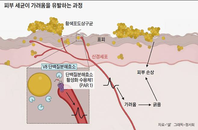 미국 하버드대 의대의 아이작 치우(Isaac Chiu) 교수 연구진은 11월 22일(현지시각) 국제 학술지 ‘셀’에 “피부에 사는 박테리아인 황색포도상구균(staphylococcus aureus)이 신경세포에 직접 작용해 가려움증을 유발한다는 사실을 처음으로 밝혀냈다”고 밝혔다.