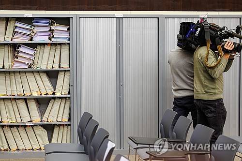 epa11035530 Members of the media film investigation and evidence files in the courtroom on the first day of the Sky ECC vast criminal organization trial after the decryption of its messaging systems in Brussels, Belgium, 18 December 2023. 129 defendants, 40 in custody, will appear in front of the judge for their participation in a criminal organization, drug and arms trafficking, attempted extortion, arbitrary detention and false imprisonment. They were charged at the end of the vast Sky ECC investigation, named after the encrypted messaging system used extensively by criminal gangs and uncovered by the Belgian police in 2021. EPA/OLIVIER MATTHYS