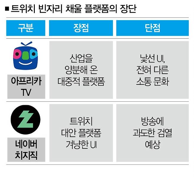 그럼 트위치가 빠진 빈자리를 차지할 업체는 어디일까. 일단 유튜브는 다소 애매한 위치에 서있다. 불편하고 기능이 몇 없는 사용자인터페이스(UI), 빠르게 반영되지 않는 시청자 채팅 등 불편한 점이 한두가지가 아니라서다. 이 때문에 업계에선 아프리카TV와 네이버가 트위치의 빈자리를 차지할 유력 후보로 내다보고 있다.