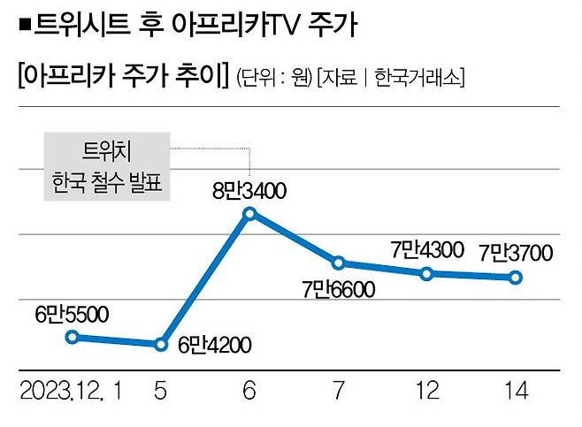 지난 5일 6만4200원에 머물러 있던 아프리카TV 주가는 트위치가 철수한다는 사실이 공표된 직후인 6일 8만3400원으로 29.9% 치솟으며 상한가를 쳤다. 아프리카TV가 트위치의 빈자리를 꿰찰 거란 투자자들의 기대감이 반영된 결과였다.