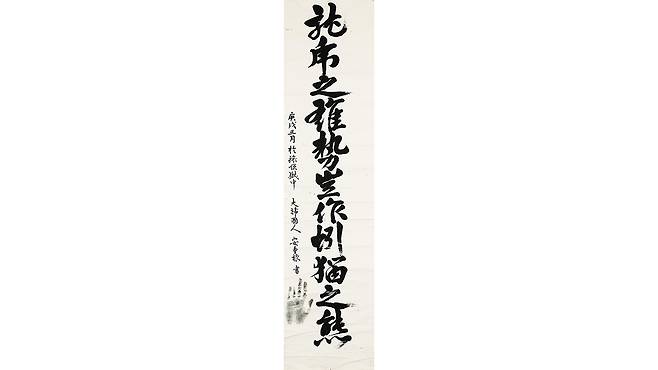 이번에 낙찰된 유묵은 행서체로 작성된 ‘용호지웅세기작인묘지태(龍乕之雄勢豈作蚓猫之熊)’라는 문구이며, “용과 호랑이의 용맹하고 웅장한 형세를 어찌 지렁이와 고양이의 모습에 비견하겠는가”라는 의미로 해석됩니다.