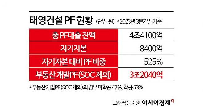 보고서에 따르면 올해 3분기 말 태영건설이 보증한 PF 대출 잔액 4조4100억원 중 민자 SOC 사업에 대한 PF 보증을 제외한 순수 부동산 PF 잔액은 3조2000억원 규모다. 이 중 절반인 47%가량이 미착공 상태여서 차입금 상환 재원을 확보하지 못했다. 또 미착공 현장의 45%가 6대 광역시를 포함한 지방에 있어, 대출 연장 없이 사업을 마감하면 태영이 당장 이행해야 할 보증액이 7200억원에 이른다.