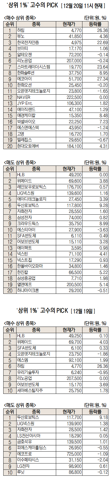 이날 미래에셋엠클럽에 따르면 미래에셋증권 주식 거래 고객 중 최근 1개월 간 투자수익률 상위 1%에 해당하는 '주식 초고수'들이 오전 11시까지 가장 많이 사들인 종목은 하림으로 집계됐다.