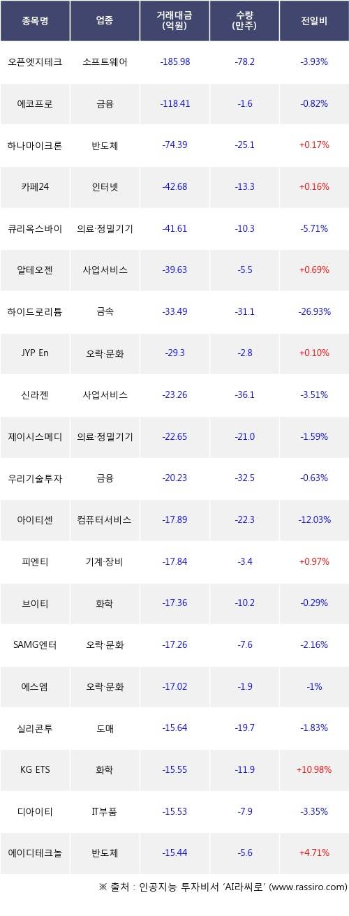 20일, 외국인 코스닥에서 오픈엣지테크놀로지(-3.93%), 에코프로(-0.82%) 등 순매도