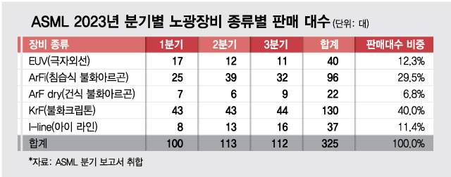 지난해 ASML의 연간보고서에 기재된 판매대수와 판매금액을 통해 계산한 EUV 장비 1대당 가격은 한화로 2400억원 정도(계측&검사 장비까지 합쳐면 3000억 정도)다. 판매대수로 가장 많이 팔리는 KrF 장비(대당 약 150억원)보다 20배 가량 비싸다.