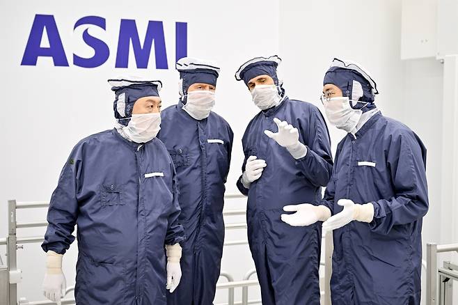 | ▲ 방진복을 입은 윤석열 대통령(왼쪽 부터)이 12일(현지시간) 벨트호벤 소재 ASML 본사에서 빌럼-알렉산더르 네덜란드 국왕과 함께 클린룸을 방문, 크리스토프 푸케 ASML 최고사업책임자의 설명을 듣고 있다. 2023.12.13 |