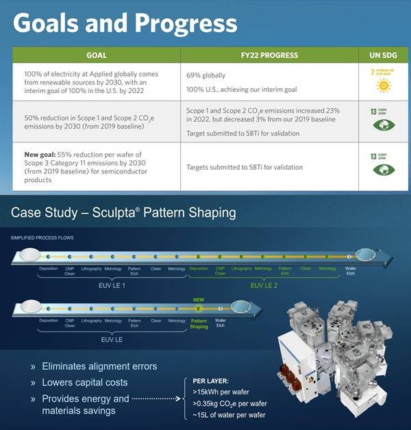 먼저 AMAT부터 보겠습니다. 2022년 AMAT의 지속가능성보고서에 따르면 2023년까지 AMAT의 전 세계 사업장에서 재생에너지를 사용하는 걸 목표로 하고 있습니다. 본사가 있는 미국의 경우 이미 100% 목표를 달성했고, 전 세계 사업장을 모두 포함하면 69%를 달성한 상황입니다. 이와 함께 2030년까지 AMAT 자사의 운영을 위한 탄소 배출(범위 1과2)은 물론 공급사와 고객사에서의 장비 운영 과정에서 발생하는 탄소 배출(범위 3)까지 배출량을 50% 이상 줄이는 걸 목표로 하고 있습니다.