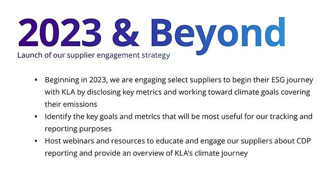 | ▲ KLA는 2023년 부터는 자사에 부품과 서비스를 제공하는 협력업체를 선정할 때도 탄소 절감과 관련한 목표와 지표를 참조하겠다고 합니다. |