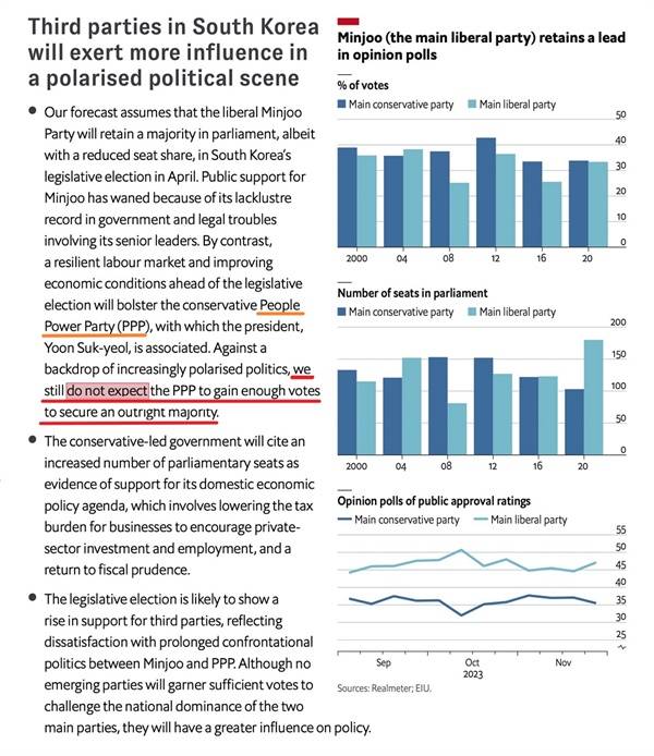 - 그러나 최신 온라인판 'Asia elections monitor 2024'에는 이렇게 나와있다. "우리는 민주당이 의석수는 줄겠지만 과반을 유지할 거라고 예상한다. 총선을 앞두고 경제가 살아나면 국민의힘 지지율이 반등할 수 있지만 과반을 확보하기는 어려울 거라고 본다. 내년 한국 총선은 민주당과 국민의힘의 대립 정치가 장기화하는 데 대한 불만이 반영돼 제3정당의 영향력이 커질 가능성이 크다."