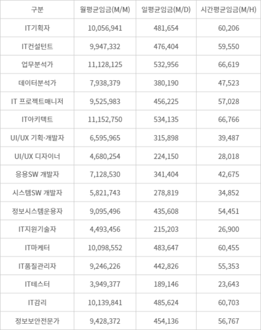 하루 평균 임금이 늘어난 직무는 △IT기획자(6만1998원) △IT컨설턴트(397원) △데이터분석가(3만 2714원) △IT아키텍트(1만 6051원) △UI/UX 기획·개발자(2만4484원) △UI/UX 디자이너(6307원) △응용SW 개발자(2만9442원) △시스템SW 개발자(3만1229원) △정보시스템 운영자(10만8955원) △IT지원 기술자(2만4984원) △IT마케터(10만4921원) △IT품질관리자(4만200원) △IT감리(2만9084원) △정보보안전문가(9만1175원)이다.
