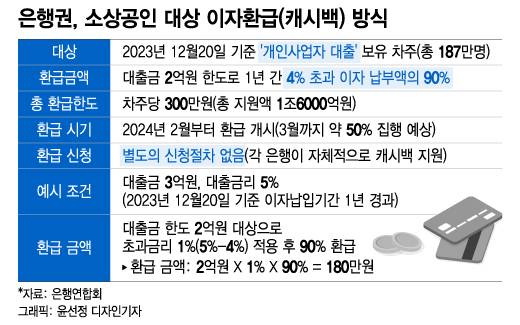 은행권이 '2조원+α(알파)' 규모의 민생금융지원방안을 마련했다. 이중 1조6000억원은 자영업자·소상공인 대상 이자 환급(캐시백)에 쓰인다. 차주당 총 환급 한도 300만원으로 187만명이 1인당 평균 약 85만원을 받을 것으로 추산된다.