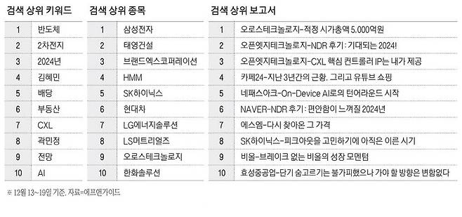 한 주 동안 투자자들 주목도가 높았던 종목은 삼성전자와 태영건설, 그리고 브랜드엑스코퍼레이션이었다. 특히 외국인 수급이 몰리며 주가가 우상향 곡선을 그리고 있는 삼성전자를 향한 개인투자자들의 관심이 뜨거웠던 것으로 나타났다. 검색 상위 보고서에는 '슈퍼 사이클' 기대감을 바탕으로 메모리 반도체 관련주에 대한 보고서들이 포진했다. 검색 상위 키워드에는 반도체, 2차전지와 더불어 새해를 앞두고 2024년이 이름을 올렸다.