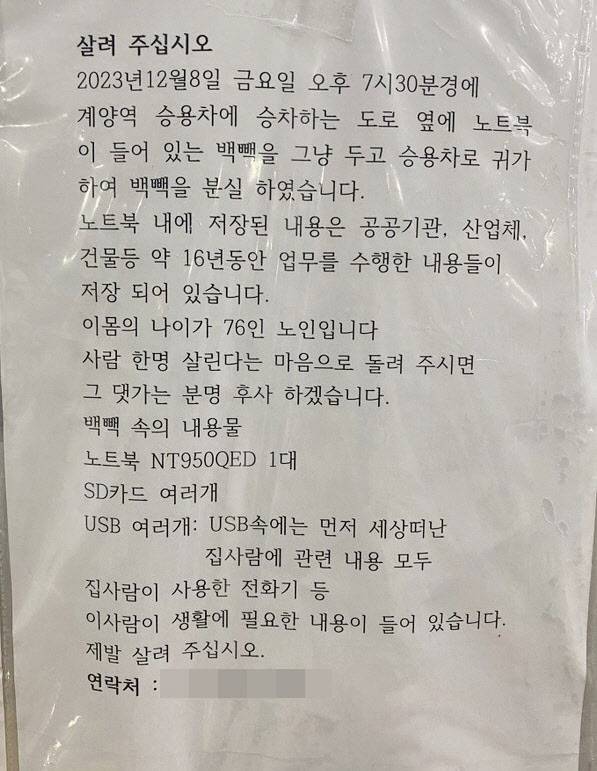 사진 속 A4 용지에는 연락처와 함께 “12월 8일 오후 7시 30분경에 계양역 도로 옆에 노트북이 든 백팩을 그냥 두고 승용차로 귀가해 백팩을 분실하였습니다”며 “노트북에 저장된 내용은 공공기관, 산업체, 건물 등 약 16년 동안 업무를 수행한 내용들이 저장돼 있습니다”라는 글이 담겼다.