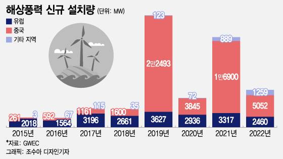 중국산 터빈을 쓸 경우, 유럽산에 비해 500~1000MW 규모 프로젝트 기준 사업비가 수천억원 더 절감되는 걸로 전해진다. 터빈 외 다른 기자재들로 평균적으로 중국 기업의 원가가 한국 제품보다 40%가량 더 저렴한 것으로 알려져 있다. 인건비 등 전반적인 제조업 기반 차이 외에 중국 자국 풍력 산업이 이미 규모의 경제를 달성, 적은 비용으로 풍력 기자재를 생산하는 생태계를 갖춰 가능한 가격경쟁력이다. 중국은 2010년대 후반 이후 해상풍력을 급격히 늘렸다. 2021년 한 해만 16.9GW을 확대해 그 해 전세계 신규 설치량의 80%를 담당했다. 현재 전세계에서 가장 큰 해상풍력 발전용량을 보유한 국가가 중국이다. 중국 풍력 공급망 기업들도 거대한 자국 시장을 기반으로 가격경쟁력과 생산능력을 구축해 왔다.