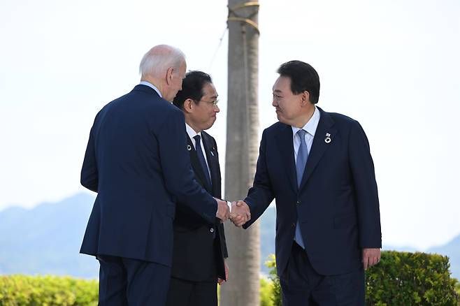 | ▲ 지난 5월 21일 G7 정상회의 참관국 자격으로 일본을 방문 중인 윤석열 대통령이 히로시마 G7 정상회의장인 그랜드프린스호텔에서 열린 한미일 정상회담에 앞서 조 바이든 미국 대통령, 기시다 후미오 일본 총리와 인사하고 있다. |