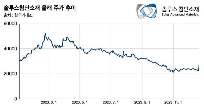 솔루스첨단소재 주가는 지난 2월 22일 5만4000원을 고점으로 우하향 곡선을 그려왔다. 전날 종가 기준 2만3000원까지 떨어졌다. 하루 평균 거래대금 규모 역시 올해 1분기 평균 126억원에서, 4분기 평균 17억원으로 쪼그라들었다. 솔루스첨단소재가 무상증자를 통해 주식 수를 늘리고 거래량 확대를 통해 주주가치를 개선하겠다고 발표한 배경이다.