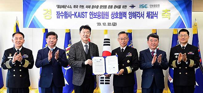 (창원=연합뉴스) 22일 경남 창원시 진해구 잠수함사에서 열린 체결식에는 강정호 잠수함사령관과 배중면 KAIST 안보융합원장 등 두 기관 주요 관계자들이 잠수함 전력 발전 상호협력을 위한 양해각서를 체결 후 기념 촬영하고 있다. 2023.12.22 [해군 제공. 재판매 및 DB 금지]
