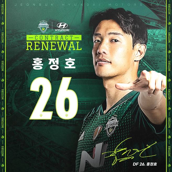 홍정호는 “전북에서 뛰는 순간이 행복하고 자랑스럽다. 전주성에 울려 퍼지는 팬들의 함성은 항상 나의 심장을 뛰게 한다”며 “계약 연장을 제안해준 구단과 응원해준 팬들에게 감사하다. 2024년에는 전북의 위용을 되찾을 수 있도록 최선을 다하겠다”고 소감을 전했다.
