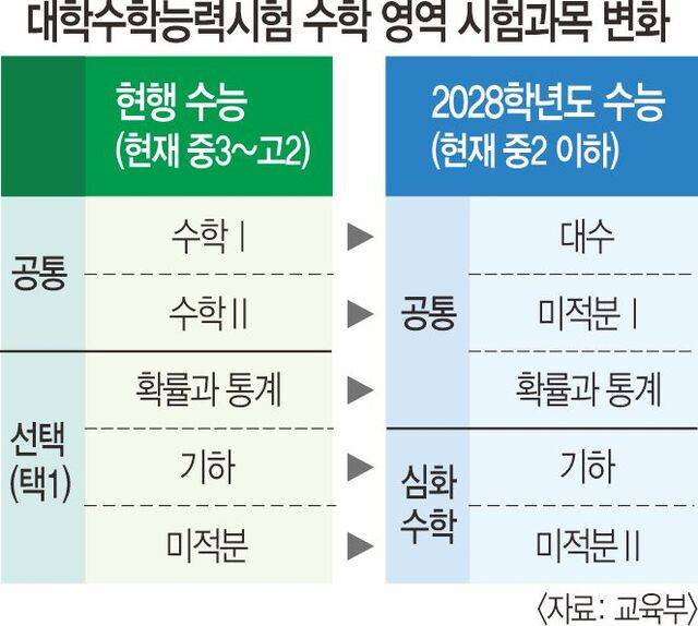 2028학년도 대입 개편 시안에는 공통과목만 치르는 방안을 담았다. 현재 수학Ⅰ에 해당하는 대수와 수학Ⅱ에 해당하는 미적분Ⅰ, 확률과 통계(과목명 동일)의 3개 과목이 공통과목이다. 기존 공통과목과 문과 수험생이 선택했던 확률과 통계만 수학 출제 범위에 포함한 것이다.