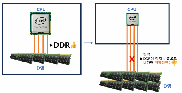 그럼 이제 여러분이 만약 D램이 더 많이 필요해서 별도의 ‘D램 창고’를 꾸려 IT 기기와 연결한다고 가정해봅시다. 이 DDR이라는 고속도로를 바깥 공간까지 주욱 뺀 뒤에 내 기존 서버와 D램 방을 연결해야 할 건데요. DDR이니까 속도는 보장이 되겠죠. 그런데 매일매일 유약한 DDR을 걱정하면서 사고가 터지지 않을지 노심초사하며 써야 합니다.