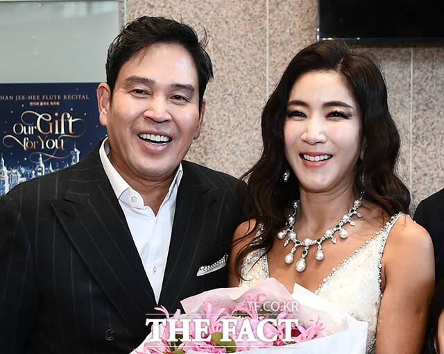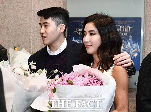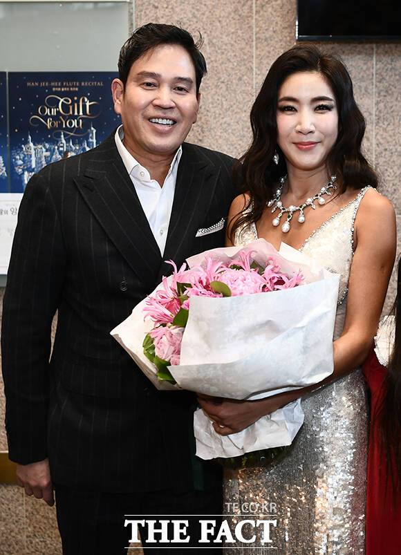 [더팩트ㅣ박헌우 기자] 정용진 신세계 부회장이 23일 오후 서울 서초구 예술의전당에서 열린 아내 한지희 '플루트 독주회'에 참석해 꽃다발을 전달 한 뒤 가족사진을 찍고 있다.