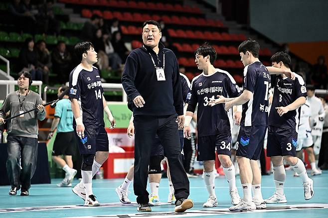 (서울=연합뉴스) 23일 충북 청주 SK호크스 아레나에서 열린 신한 SOL페이 2023-2024 핸드볼 H리그 남자부 2라운드 인천도시공사와 두산의 경기. 역전으로 패배한 두산 윤경신 감독이 아쉬워하고 있다. 2023.12.23 [한국핸드볼연맹 제공. 재판매 및 DB 금지]