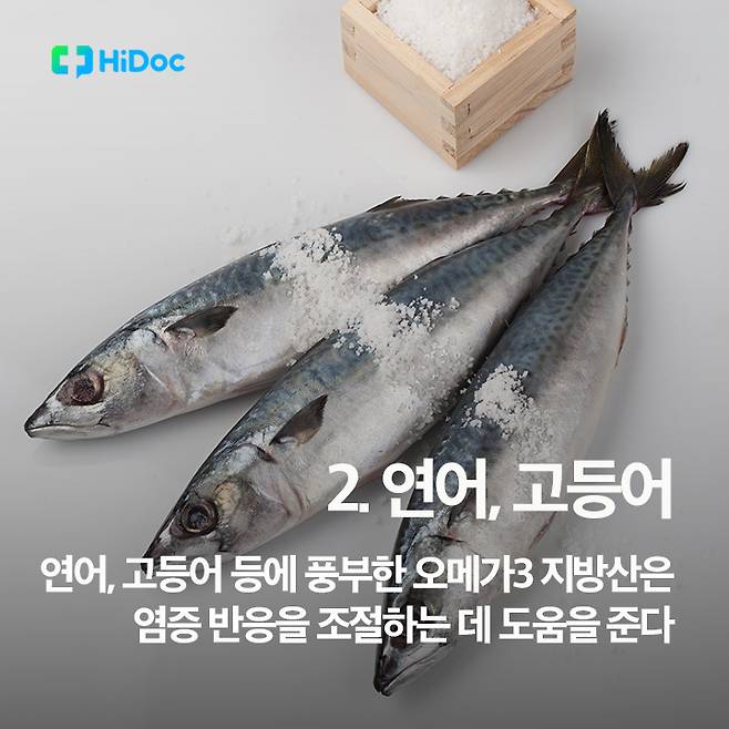 2. 연어, 고등어 연어, 고등어 등에 풍부하게 들어 있는 오메가3 지방산은 염증 반응을 조절하는 데 영향을 끼친다.