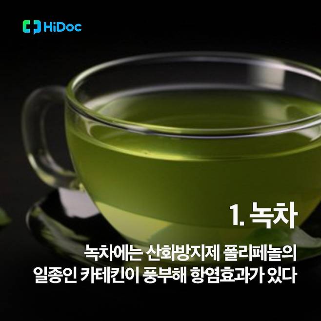 녹차에는 활성산소와 싸우고 만성질환을 예방하는 산화방지제 폴리페놀의 일종인 카테킨이 풍부하다. 카테킨은 항염 효과 이외에도 항암 효과, 혈압 조절, 충치 예방 등에도 효과가 있다. 녹차에는 카페인이 들어 있어 카페인 민감도가 높은 사람은 하루에 한 잔만 마시는 것이 좋다.