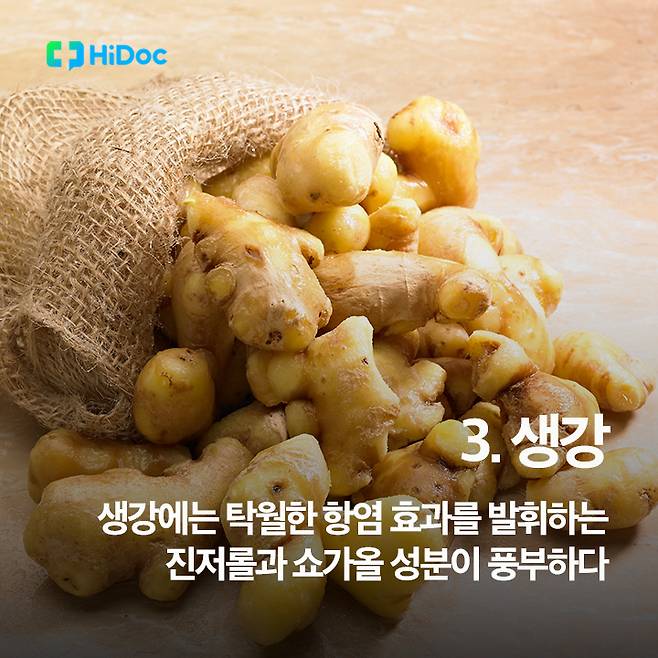 생강은 진저롤과 쇼가올 성분이 풍부해 탁월한 항염 효과를 발휘한다. 특히 알레르기로 인해 부어오르는 증상을 가라앉히는 데 효과적이다. 생강은 구운 음식이나 튀김 등에 곁들여 먹거나, 매일 따뜻한 생강차를 마시는 것도 좋은 방법이다.