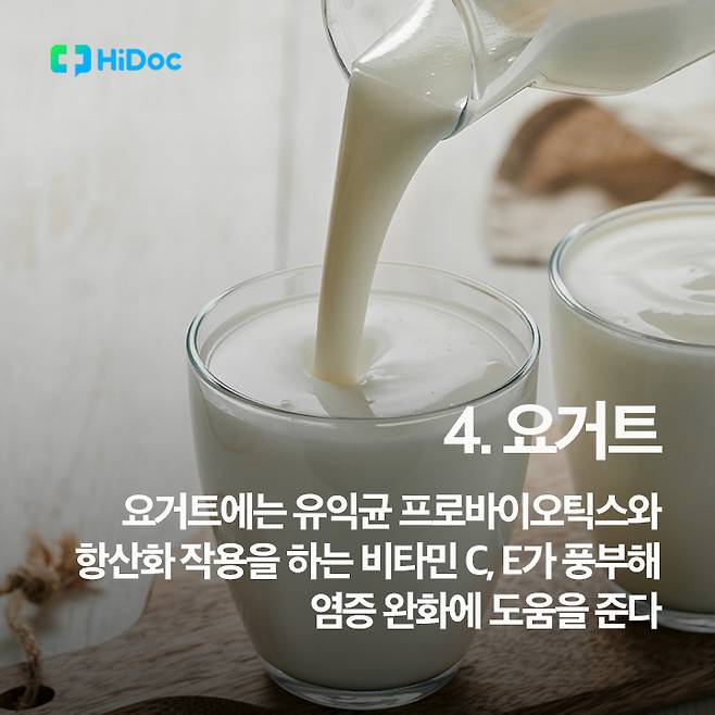 요거트에는 장내 유익균인 프로바이오틱스가 풍부하다. 장내 미생물의 균형이 깨지면 염증성 질환 위험이 증가하는데, 프로바이오틱스가 생성하는 젖산이 장내 환경을 산성으로 만들어 유해균을 죽이고 유익균은 증식시킨다. 항산화 작용을 하는 비타민 C, E도 풍부하게 들어 있어 염증 완화에 도움을 준다.