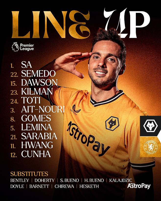 경기에 앞서 양 팀 선발 명단이 공개됐다. 홈팀 울버햄프턴은 3-4-3 포메이션으로 나섰다. 부상으로 그동안 전력에서 이탈했던 조세 사가 오랜만에 골문을 지켰다. 크레이그 도슨, 맥스 킬먼, 토티 고메스가 백3를 구성했다. 아이트 누리, 주앙 고메스, 마리오 르미나, 넬송 세메두가 중원을 형성했으며 황희찬은 파블로 사라비아, 마테우스 쿠냐와 함께 최전방 3톱으로 선발 출격했다.