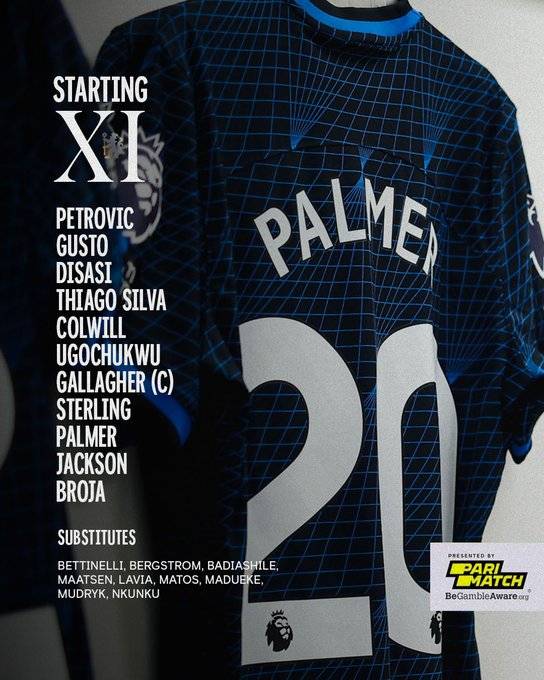 원정팀 첼시는 4-2-3-1로 맞섰다. 조르제 페트로비치가 골키퍼 장갑을 꼈다. 수비는 말로 귀스토, 악셀 디사시, 티아구 실바, 리바이 콜윌이 맡았다. 레슬리 우고추쿠, 코너 갤러거가 허리를 받쳤으며 라힘 스털링, 콜 팔머, 니콜라 잭슨이 2선에 위치했다. 최전방 원톱은 아르만도 브로야가 맡았다.