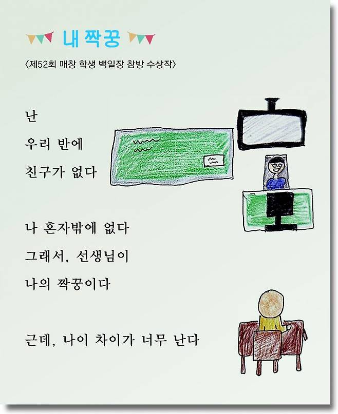 | “내 짝꿍은 선생님” 내달 폐교 부안 백련초교 학생의 동시와 그림 텅 빈 교실에 남겨진 학생 한 명과 선생님 한 명. 다음 달 5일 폐교를 앞둔 전북 부안군 하서면 백련초 학생이 지은 시 ‘내 짝꿍’과 직접 그린 그림이다. 백련초 교직원들은 마지막 추억을 만들어 주기 위해 이 작품 등 재학생 8명의 작품을 모아 동시집 ‘코딱지’를 제작했다. 이 작품은 제52회 매창 학생 백일장에서 상을 받기도 했다. 백련초교 제공 |