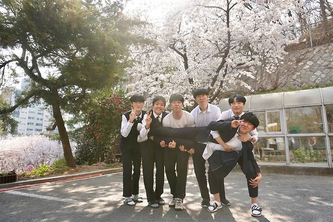 | ▲ 벚꽃나무 앞에서 찍은 SCV 단체사진 계절이 바뀔 때마다 이곳에서 장유리 선생님은 SCV 학생들의 단체 사진을 찍는다 |