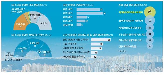 수도권 아파트 매매가격에 대한 전문가들의 내년 전망이 다소 엇갈린 반면, 전셋값은 내년에도 올 하반기처럼 오름세가 지속될 것이라는 의견이 압도적이었다. 매매 수요의 전세 전환 현상이 지속되고, 특히 서울의 경우 신축 입주물량이 급감할 것이 분명하기 때문이다. 주택 공급을 활성화하기 위해선 무엇보다 재건축초과이익환수제 폐지를 비롯한 재건축 규제가 추가로 완화될 필요가 있다는 제언이 절반 가까이 나왔다.