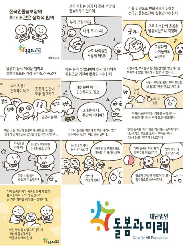 이미 돌봄은 시대정신이자 여야 공통의 과제가 됐다. 모든 정당이 돌봄을 ‘합의 과제’로 수용하고 서로 누가 더 잘하는지 숨 가쁜 경쟁을 해야 하는 상황이다. 이런 합의를 바탕으로 국민의 폭증하는 의견을 받아 정치가 최선의 돌봄체계를 만들어 나가야 한다.