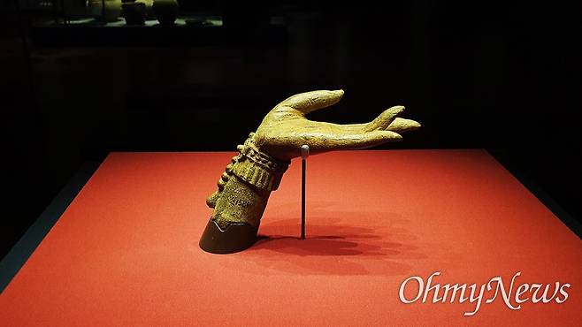 금제사리 항아리는 보기에도 매우 화려하고 아름답다. 항아리 표면에 새겨진 문양이 보통 섬세한 게 아니다. 보는 사람마다 넋을 잃고 바라본다. 하지만 이곳에서 정작 내 시선을 사로잡은 것은 작은 '보살 손'이다. 유리관 안에서 팔뚝이 끊어진 손 하나가 은은한 빛을 발한다. 그 손이 금제사리 항아리 이상으로 정교하게 조각됐다.