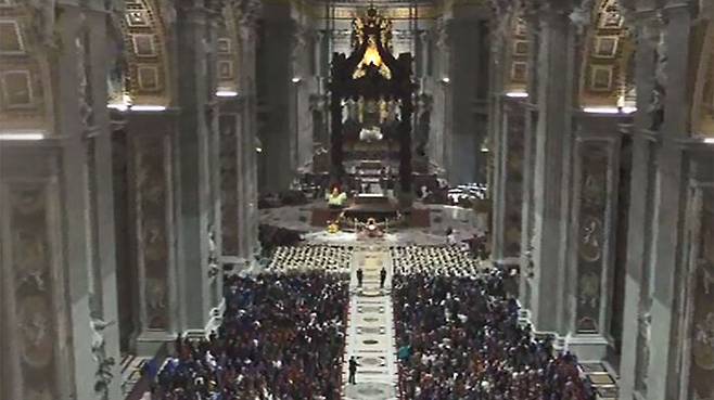 아기 예수의 탄생을 축하하는 성가가 울려 퍼지는 가운데 휠체어를 탄 프란치스코 교황이 대성당 안으로 들어옵니다.