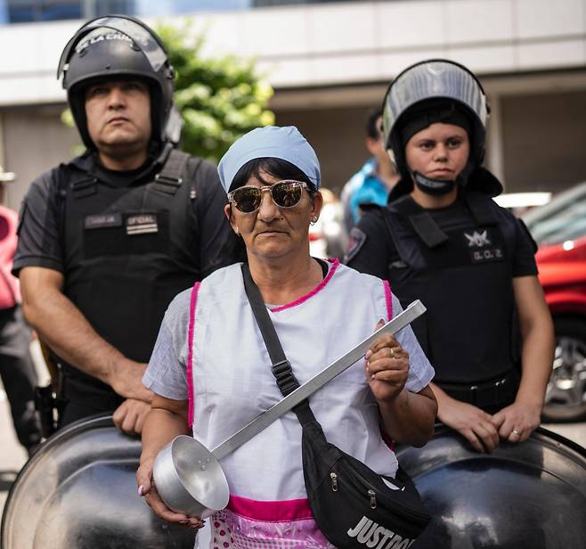 | “무료 급식소 지원 늘려라” 국자 시위 아르헨티나 수도 부에노스아이레스에서 22일 한 시민이 국자를 들고 무료 급식소 지원 확대를 요구하는 1인 시위를 하고 있다. 부에노스아이레스=AP 뉴시스 |