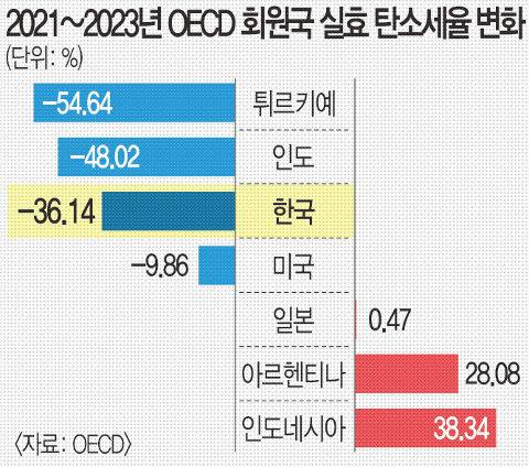 25일 OECD의 '실질 탄소세율 2023' 보고서 따르면 올해 한국의 실질 탄소세율은 2021년에 비해 36.14% 하락했다.