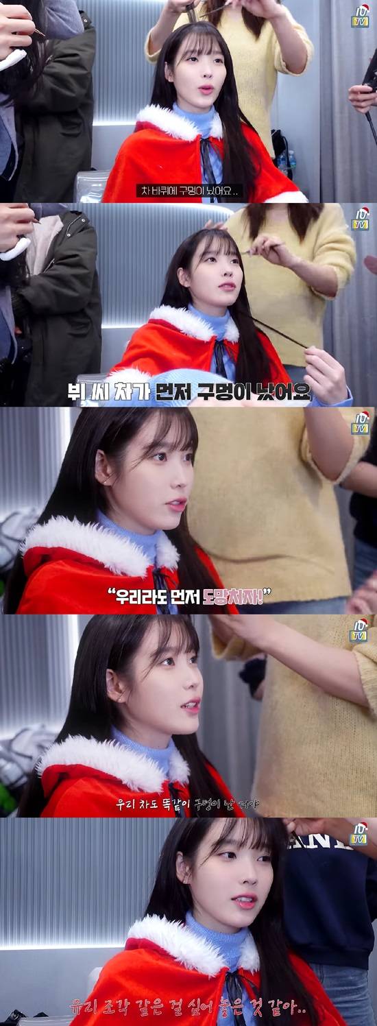 아이유는 "사실 도망가려고 했는데 차 바퀴에 구멍이 났다. 진짜 웃긴 게 뷔의 차에 먼저 구멍이 났다"고 실토했다. 그는 "그래서 우리라도 도망가자 했는데 우리 차도 똑같이 구멍이 난 거다. 우리 도망 못 가게 하려고 촬영장 곳곳에 유리 조각 같은 걸 심어놓은 것 같다"고 의심해 웃음을 자아냈다.