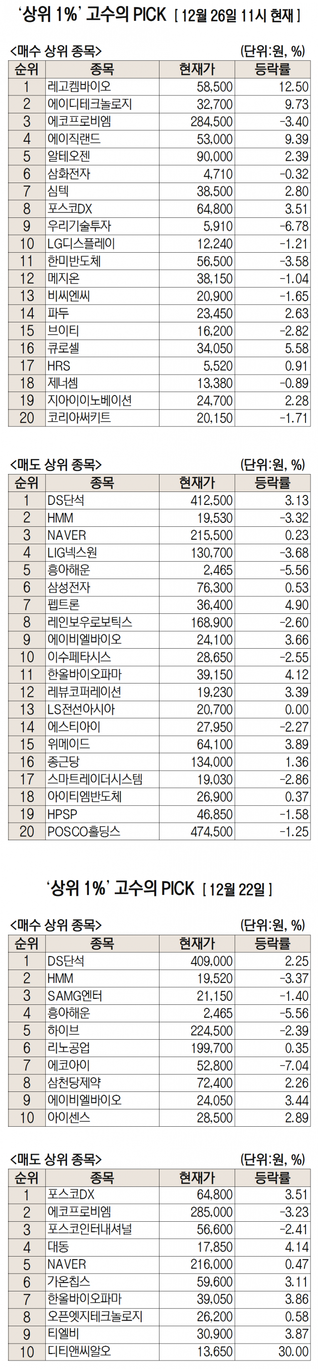 미래에셋증권에서 거래하는 고수익 투자자들이 26일 오전 가장 많이 순매수한 종목은 레고켐바이오(141080)로 나타났다. 에이디테크놀로지(200710), 에코프로비엠(247540), 에이직랜드(445090) 등도 순매수 상위권에 이름을 올렸다.