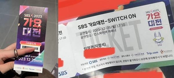 | ▲ 각종 SNS, 커뮤니티 등에서 소개된 SBS 가요대전 입장권. 좌측 사진이 가짜 입장권 |
