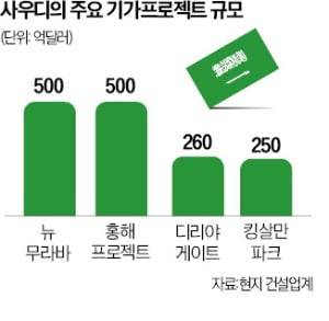 현지 건설업계와 중동 건설 정보업체 미드 프로젝트에 따르면 사우디에서 진행 중인 기가 프로젝트는 17건에 이른다. 일반적으로 메가 프로젝트가 10억달러 이상(약 1조3000억원), 기가 프로젝트는 100억달러(약 10조3000억원) 이상 프로젝트를 통칭한다.